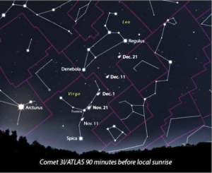 3I/Atlas è entrato nel nostro sistema solare il 21 maggio 2025, proprio tra la punta della freccia nell’arco del Sagittario e le stelle del Serpente nella costellazione di Ofiuco, molto vicino al centro galattico. Quindi, la sua nascita nel nostro sistema solare ha questa concreta relazione galattica. Il suo percorso attraversa lo Zodiaco dal Sagittario fino ai Gemelli, da dove se ne andrà il 17 aprile 2026. Di seguito sono riportate due mappe della traiettoria dell’oggetto. La prima immagine lo mostra vicino a Spica il 2 novembre (ci torneremo sopra) e poi mentre passa sopra la Vergine e il Leone, arrivando alla stella Regolo (il Cuore del Leone) a Natale.