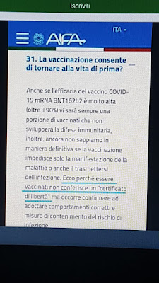 La parte più inquietante è però, la frase ufficiale sponsorizzata dall’Agenzia italiana del farmaco: “Non conferisce un certificato di libertà”.