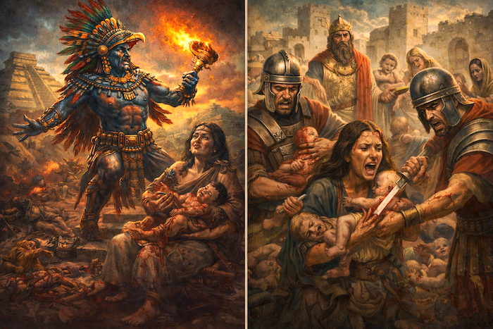 Interessante altresì indagare il parallelo tra gli eventi di Gaza ed i Misteri messicani del Male. Se da una parte osserviamo in Palestina il rituale di magia nera di Erode, con il sacrificio di bambini innocenti, dall’altra ci appare l’immagine speculare in Messico, con il tentativo di uccidere Huitzilopochtli, l’eroe solare, prima della nascita.