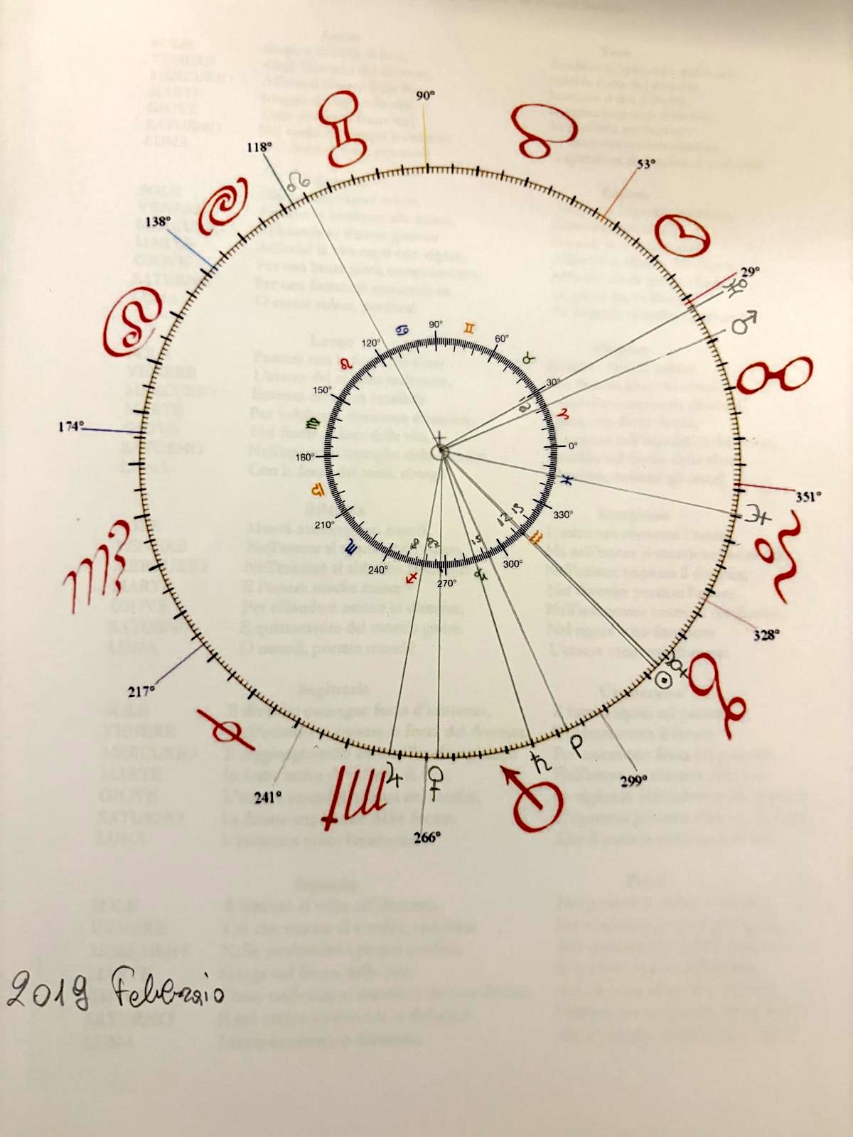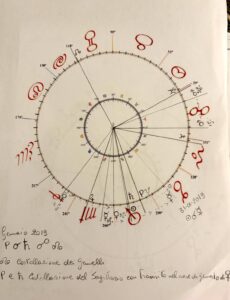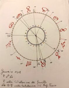 Ebbene, confrontando le carte relative al gennaio/febbraio 1918 con quelle del gennaio/febbraio 2019 – gentilmente realizzate da Diana Bachis che ringrazio – notiamo anzitutto l’inversione del nodo Nord nelle due costellazioni protagoniste, quella del Sagittario e quella dei Gemelli sotto Plutone.