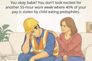L’operaio edile in quel meme non è impotente. È distratto. È esausto. Lavora 55 ore e vede scomparire il 40% del suo stipendio, e gli viene consegnato un menu di lamentele approvate tra cui scegliere, in modo che la sua legittima rabbia sia diretta verso il suo vicino invece che verso le persone che hanno costruito il sistema che lo sta divorando vivo.
