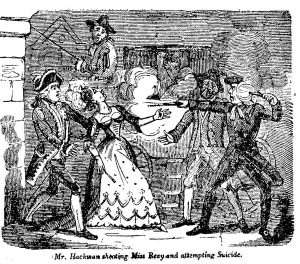 Poi, tentò di uccidersi con l’altra pistola ma si procurò solo una ferita superficiale, continuò a picchiarsi con entrambe le pistole scariche fin quando fu arrestato e portato, con il cadavere di Martha, in una taverna in St. James’s Street. Due lettere furono trovate indosso ad Hackman, una indirizzata a suo cognato, Frederick Booth, e una lettera d’amore per Martha Ray: entrambe più tardi furono portate come prove al processo per omicidio.