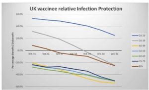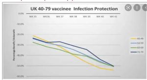 I dati di resistenza all’infezione dell’intera comunità di persone vaccinate dai 40 ai 79 anni sono, infatti, profondamente negativi, in particolare sono adesso sotto il 50%, il che significa che soffrono più del doppio del tasso di infezione rispetto alle loro controparti non vaccinate, e tale trend sembra non arrestarsi, anzi…. Data la tendenza costante e fortemente negativa per tutte le coorti di adulti, è impossibile indovinare dove o quando queste traiettorie potrebbero raggiungere il fondo.