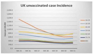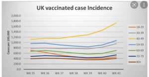 Dai dati dell’agenzia per la sicurezza sanitaria del Regno Unito (UK Health Safety Agency), che pubblica sistematicamente statistiche Covid dettagliate per gruppo di età e stato di vaccinazione, si può notare come nelle ultime sette settimane i completamente vaccinati soffrano di tassi di infezione molto più alti rispetto ai non vaccinati e questi dati peggiorano di giorno in giorno.