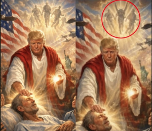 Ce ne sono due sullo schermo. Quello a destra è quello che ha diffuso, e raffigura lui stesso: Donald Trump, presidente degli Stati Uniti, vestito da Gesù, mentre guarisce un uomo. Si può vedere il potere curativo che emana dalla sua mano destra.